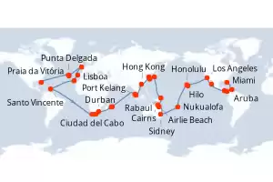 Itinerario : Miami, Praia da vitoria, Punta Delgada, Southampton, Lisboa, Santa Cruz de Tenerife, Santo Vincente, Ciudad del Cabo, Puerto Elizabeth, Durban, Isla de la Reunion, Ile Maurice, Port Kelang, Singapur, Hong Kong, Pusan, Nagasaki, Kagoshima, Yokohama, Rabaul, Cairns, Airlie Beach, Sidney, Nukualofa, date, Honolulu, Hilo, Los Angeles, Cabo san Lucas, Puntarenas, Canal de Panama, Aruba, Miami