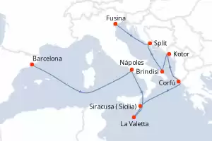 Itinerario : Barcelona, Nápoles, La Valetta, Siracusa ( Sicilia), Corfú, Kotor, Brindisi, Split, Fusina