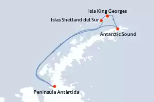 Itinerario : Isla King Georges, Antarctic Sound, Peninsula Antártida, Islas Shetland del Sur, Isla King Georges, Antarctic Sound, Peninsula Antártida, Islas Shetland del Sur, Isla King Georges