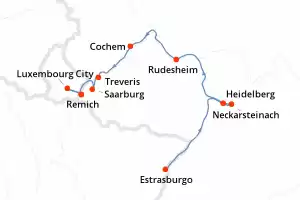 Itinerario : Estrasburgo, Neckarsteinach, Heidelberg, Mainz, Frankfurt, Rudesheim, Coblenza, Cochem, Treveris, Saarburg, Remich, Luxembourg City, Remich