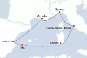 Itinerario : Genova, Marsella, Valencia, Ibiza, Cagliari, Civitavecchia - Roma, Genova