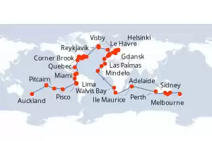 Itinerario : Sidney, Melbourne, Adelaide, Perth, Ile Maurice, Ciudad del Cabo, Walvis Bay, Mindelo, Las Palmas, Casablanca, La Coruña, Le Havre, Brujas, Gdansk, Visby, Helsinki, Tallin, Estocolmo, Copenhague, Ijmuiden, Dover, Lerwick, Reykjavik, Grundarfjordur, Isafjordhur, St Johns, Corner Brook, Quebec, Saguenay, Charlottetown, Sidney, Halifax, Nueva York, Miami, Cartagena de Indias, Gatun, Manta, Lima, Pisco, Isla de Pascua, Pitcairn, Papeete, Moorea, Auckland, Sidney, Brisbane
