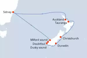 Itinerario : Sidney, Milford sound, Doubtfoul, Dusky sound, Dunedin, Christchurch, Tauranga, Auckland, Sidney