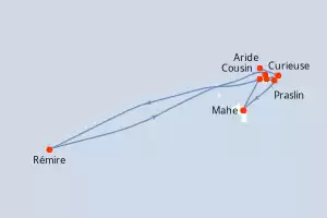 Itinerario : Mahe, Cousin, Rémire, Curieuse, Aride, Grande soeur, Praslin, La Digue, Mahe