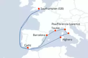 Itinerario : Southampton, Cadiz, Barcelona, Toulon, Pisa/Florencia (Livorno), Civitavecchia - Roma, Ajaccio, Southampton