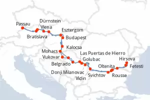 Itinerario : Passau, Viena, Esztergom, Budapest, Mohacs, Belgrado, Golubac, Donji Milanovac, Svichtov, Rousse, Hirsova, Fetesti, Oltenita, Giurgiu, Vidin, Las Puertas de Hierro, Novi Sad, Vukovar, Mohacs, Kalocsa, Budapest, Bratislava, Dürnstein, Melk, Passau